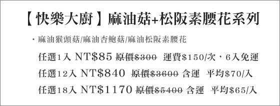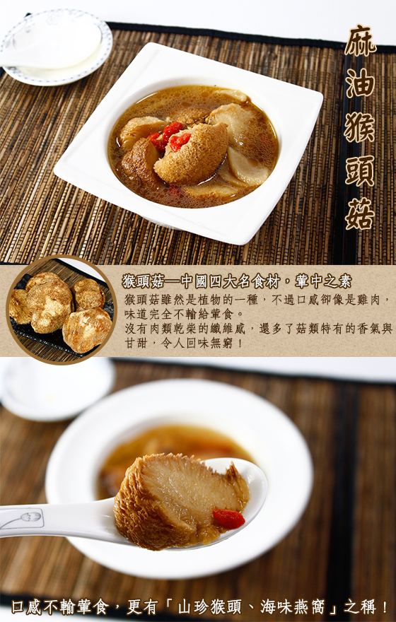 商品口味:麻油猴頭菇/麻油杏鮑菇/麻油松阪素腰花
